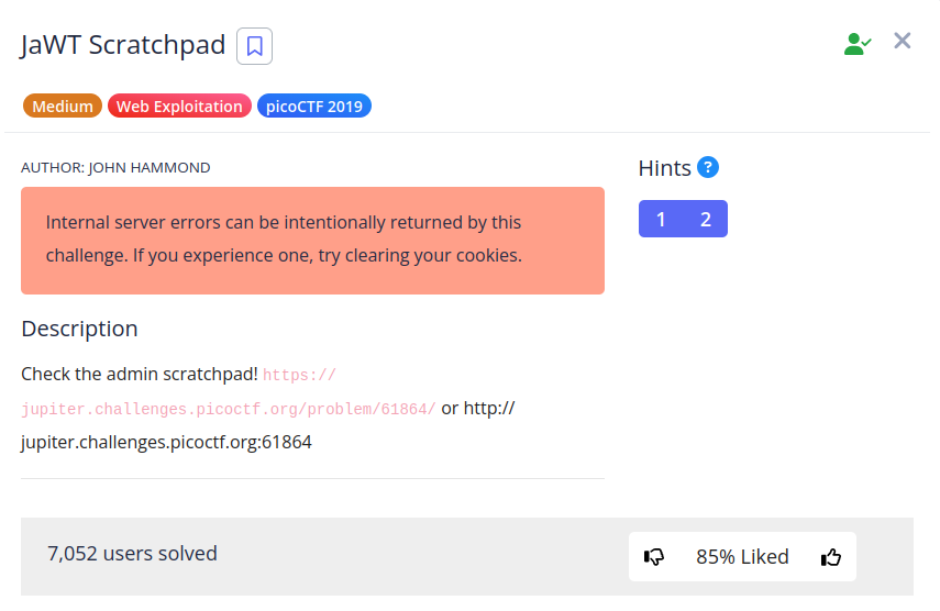 By plugging this cookie into https://jwt.io, we see that the algorithm is “HS256” (HMAC SHA256) and that the payload is "user": "test":