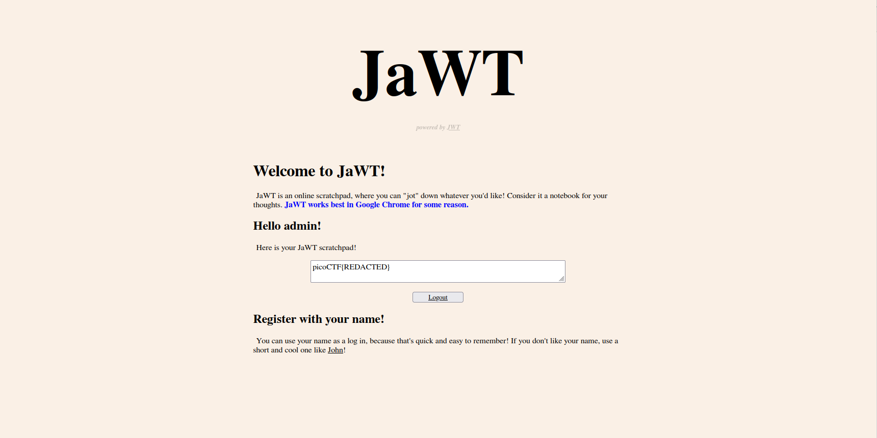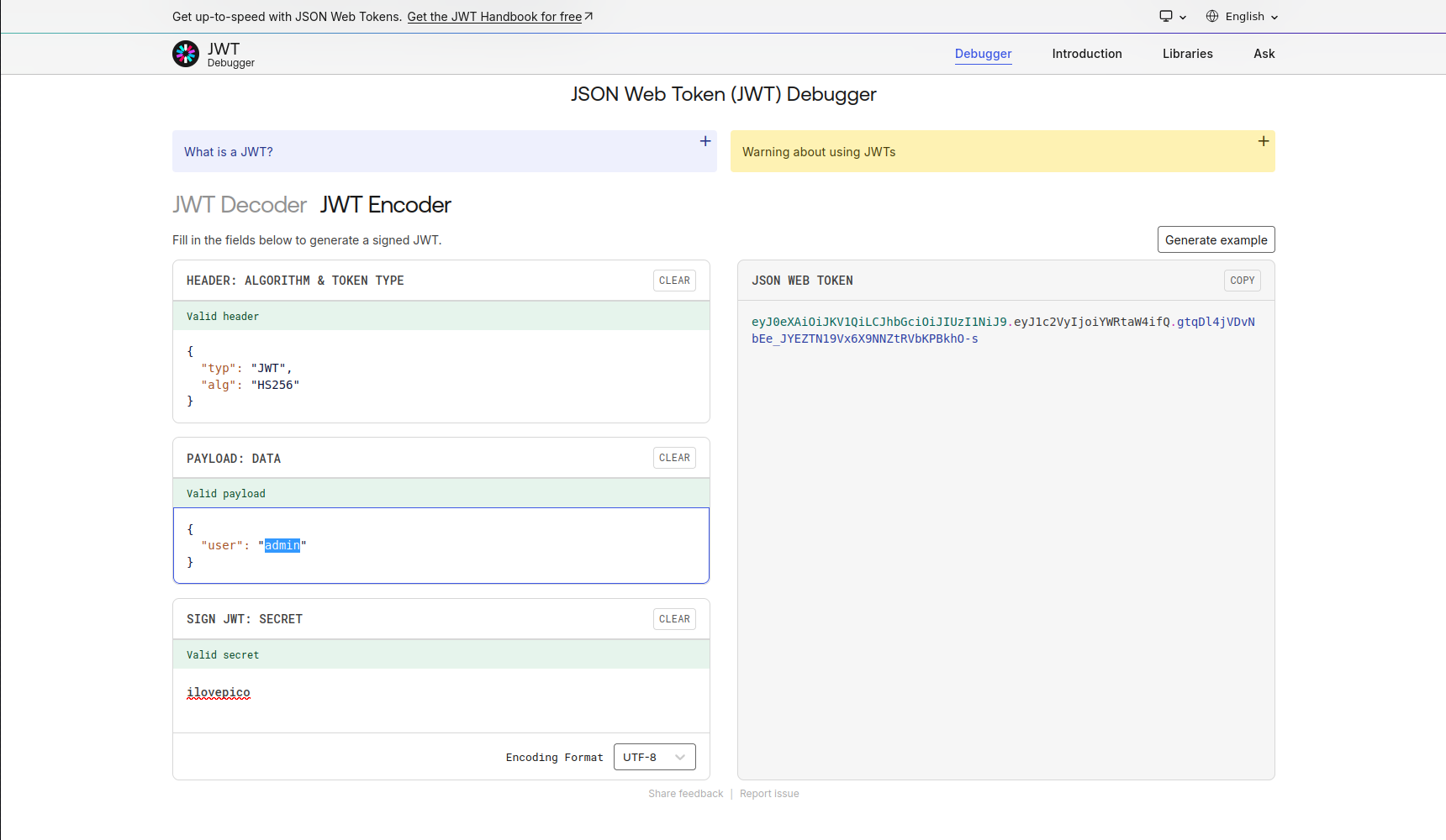 This spits out the secret ilovepico! Back to https://jwt.io, we can forge a token signed with this secret: