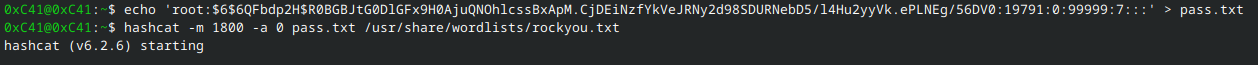 hashcat -m 1800 -a 0 <file-containing-root-shadow-entry> <wordlist>This is demonstrated as follows: