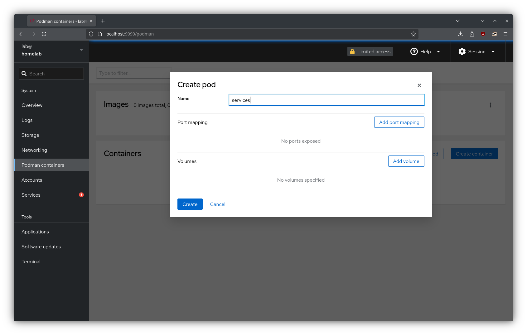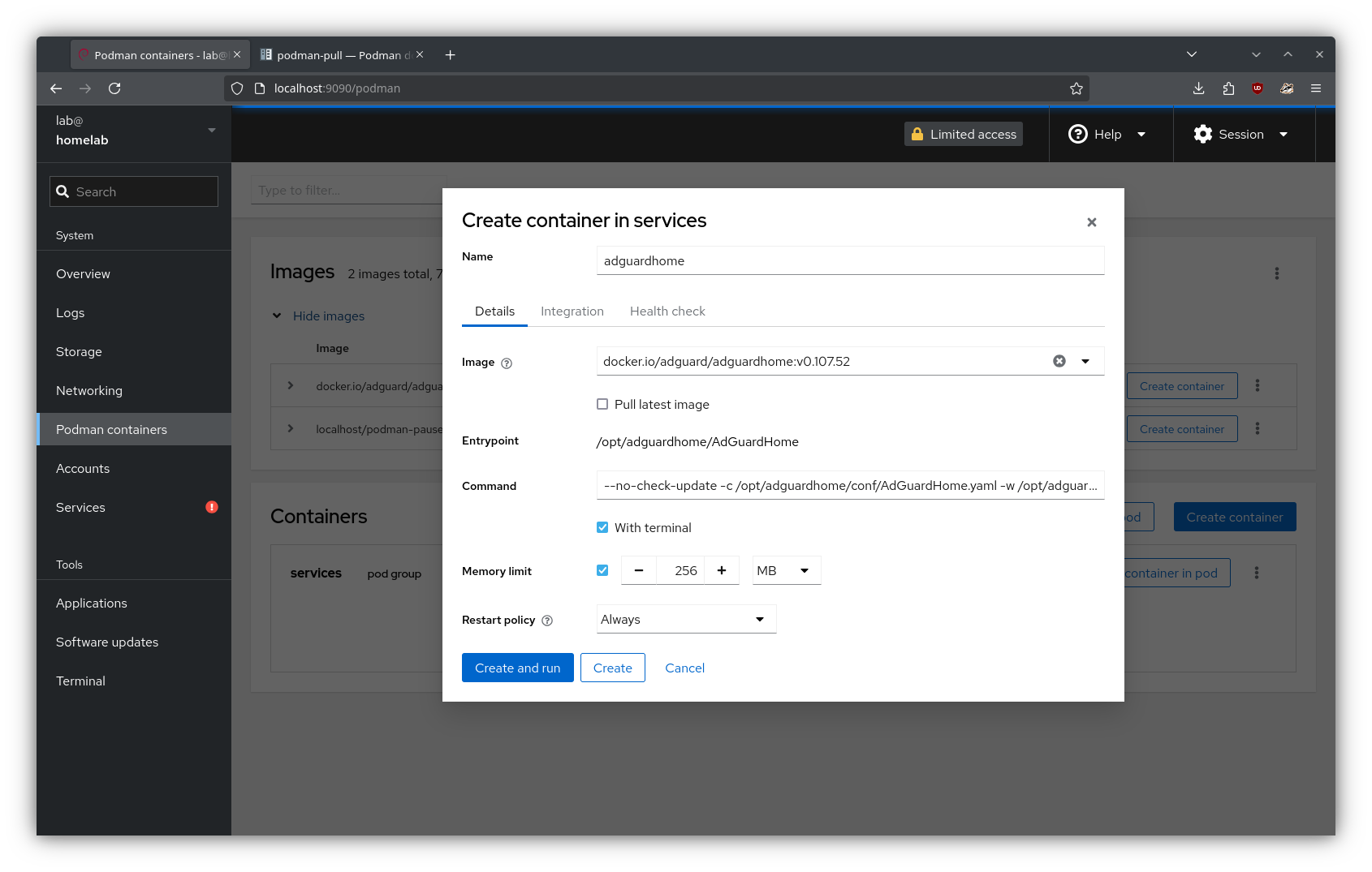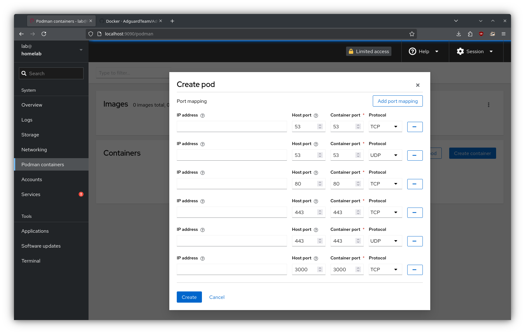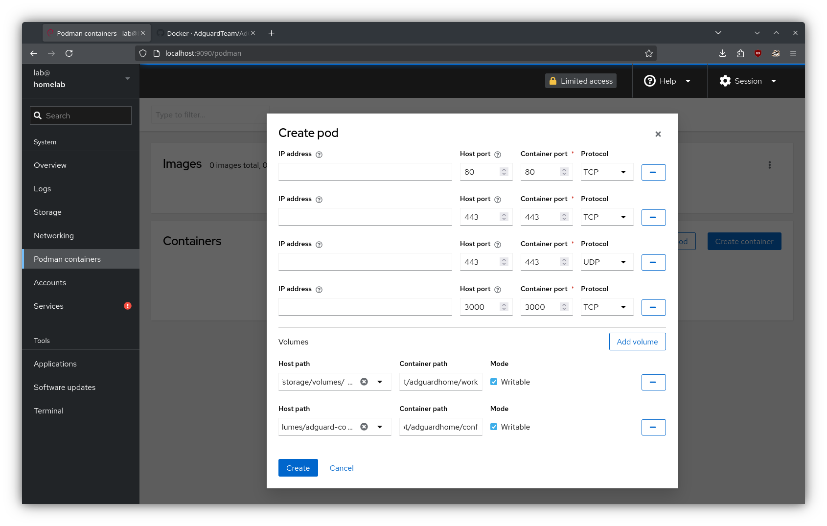 From the “Podman containers” tab in Cockpit, I created a new pod named “services”. Here, I defined the relevant port mappings and volumes for AdGuard (using the volume mounts created in the previous step):
