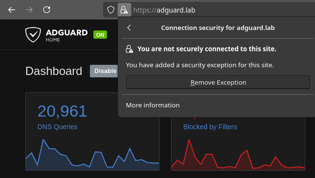 Navigating to http://adguard.lab, for example, the connection is upgraded to HTTPS! However, since the certificates are self-signed, I had to set an exception for the domain: